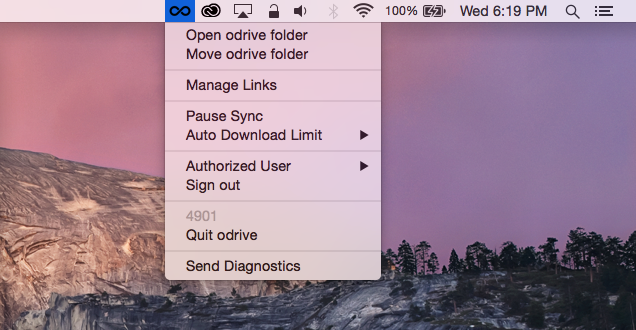 Access the odrive system icon to see real-time sync status, transfer status, and configuration options.